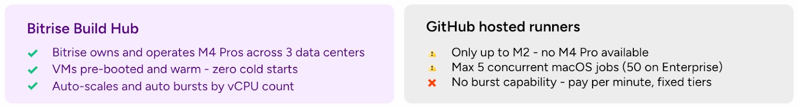 GitHub caps concurrent macOS jobs at 5 (standard) or 50 (Enterprise), with no burst option. AWS EC2 Mac requires a 24-hour minimum host commitment per machine. Bitrise Build Hub prewarms VMs ahead of Github Actions job execution, scales automatically by vCPU count, and handles peak load without over-provisioning.