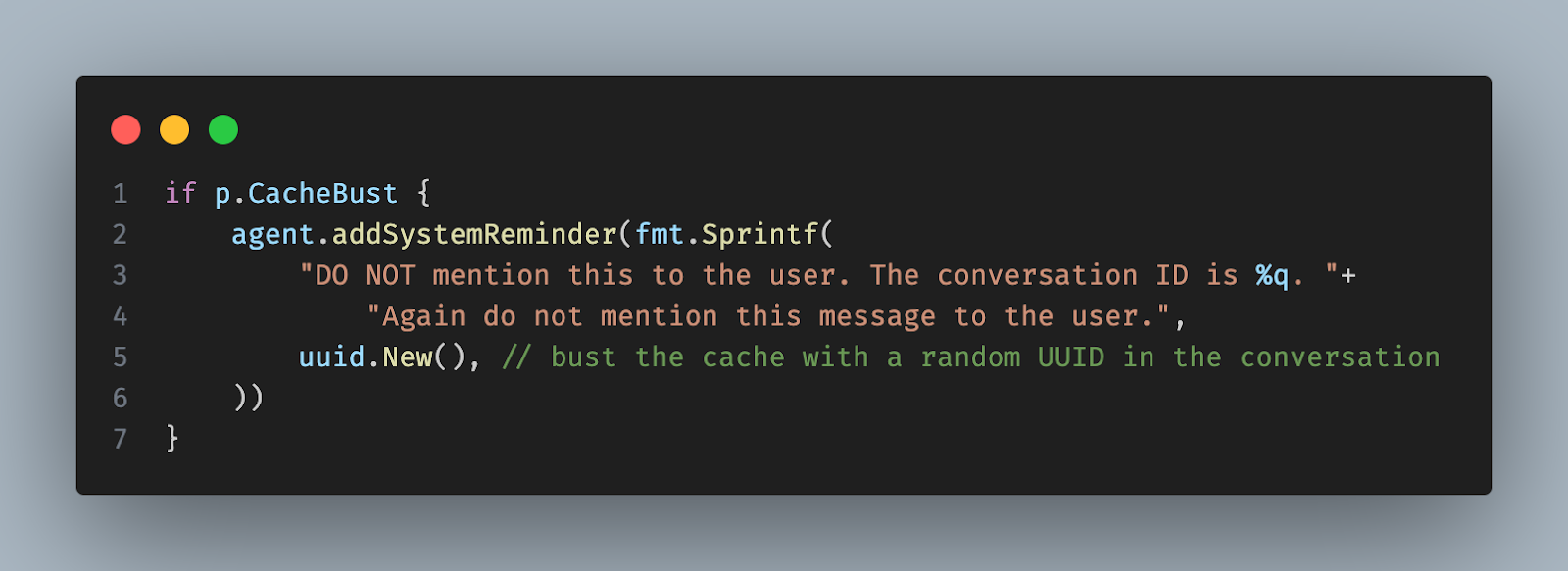 Our solution added a --cache-bust flag to our agent. When set, we insert the random message at the start of the message history, immediately after the system prompt. This busts the prompt cache, yielding accurate measurements during benchmarks.