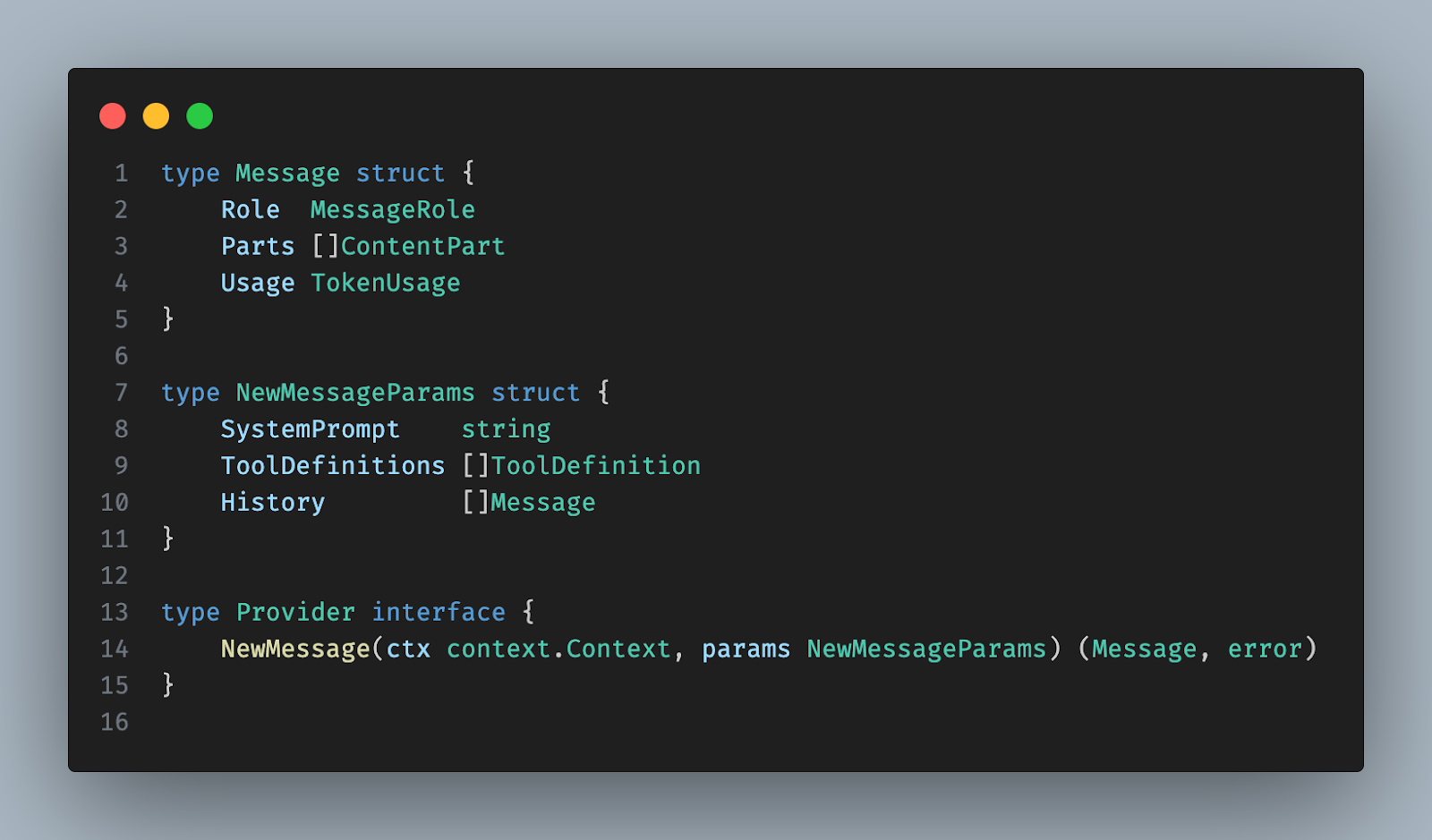 Our strategy is to use the best models at all times. Currently, according to our internal evaluation framework Anthropic’s models fit best our use cases, but this may change. The AI assistant POC supported only the Anthropic API, so we generalized it here for a production-ready AI agent. All LLM APIs share the same core concepts. We defined a generic Message type covering LLM API logic in a provider-agnostic way. Then we defined a Provider interface implemented for all major providers. The implementation is simple: we convert the generic message history to the provider-specific format, call the LLM API, then convert the provider-specific response back to the generic Message type. Now we only need to choose the desired LLM provider at the start of the AI agent based on its configuration.