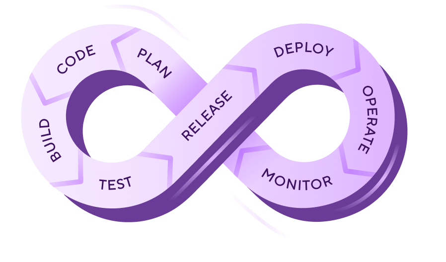 The DevOps lifecycle is often visualised as an infinity loop (∞), with eight continuous phases that feed into each other.